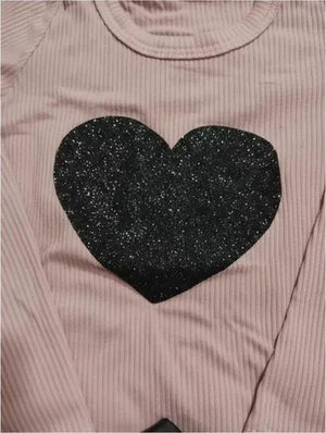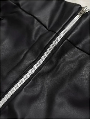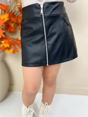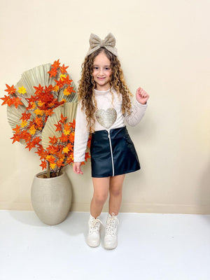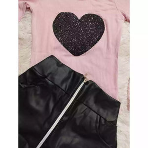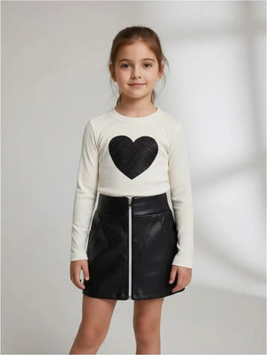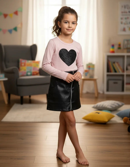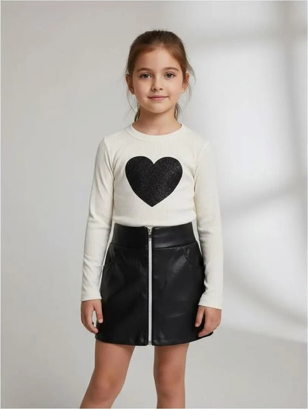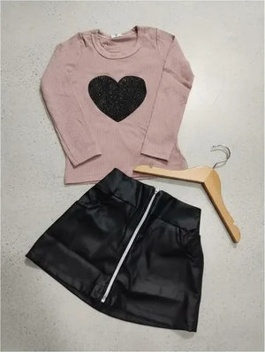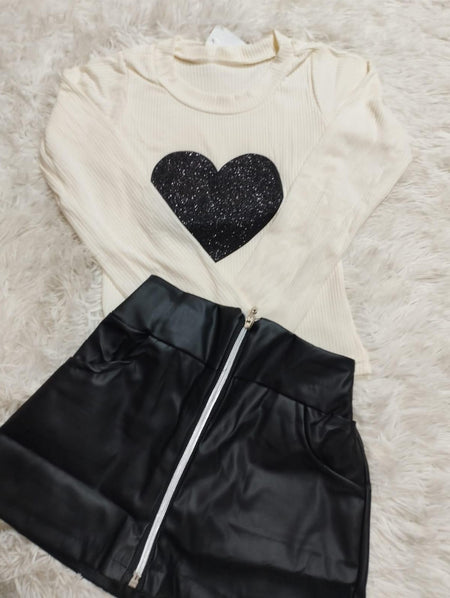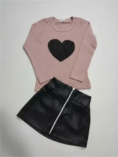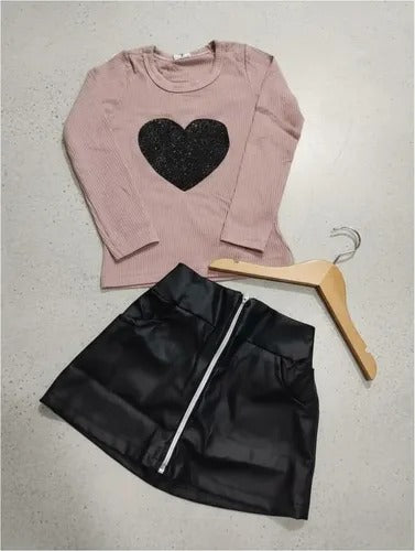 Conjunto moda infantil feminina, blusa manga longa em tecido ribana, , saia couro eco com detalhe em ziper que deixa a peça super estilosa, possui elástico na cintura na parte de trás, um luxo de lookinho.