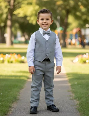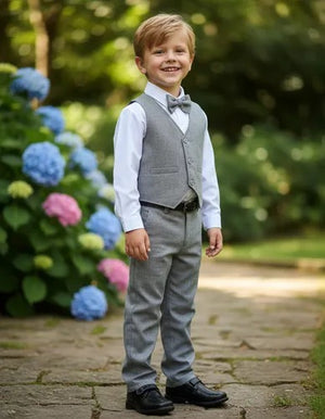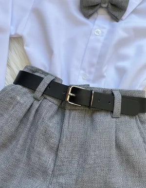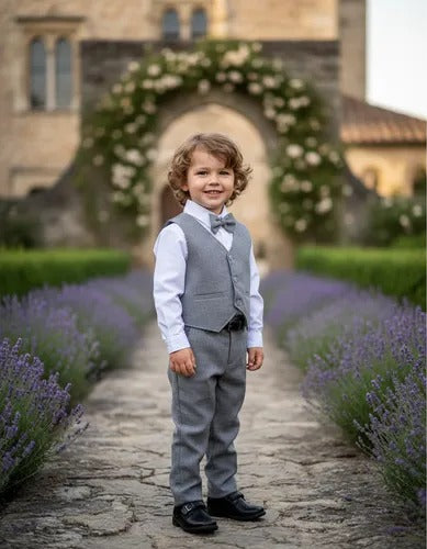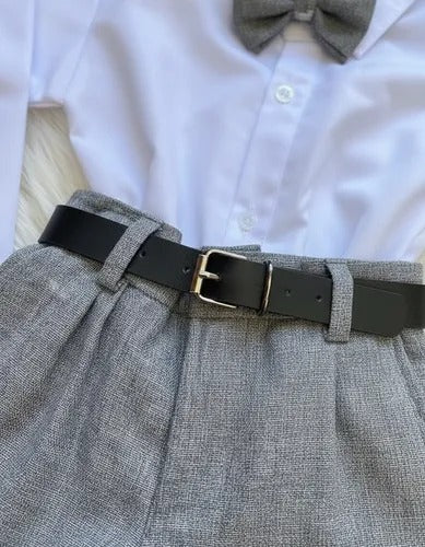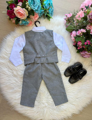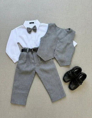 Conjunto composto por: Camisa social na cor Branca manga longa, gravata borboleta Cinza, calça na cor cinza, colete de alfaiataria cinza e cinto.