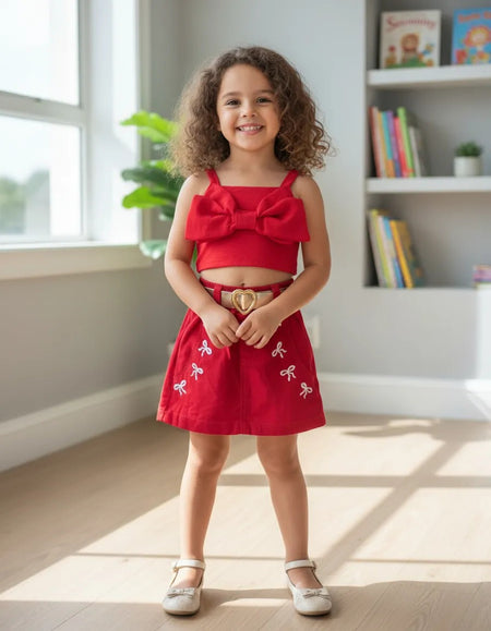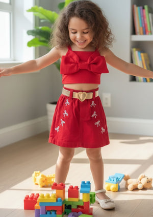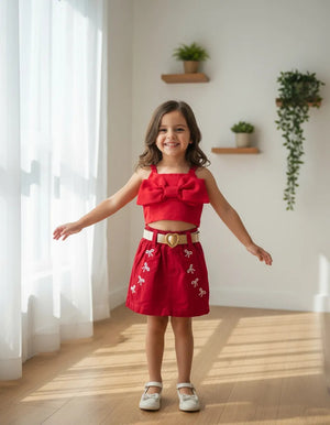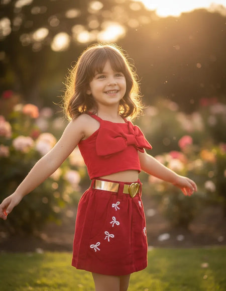 Parte de Baixo (Shorts-Saia): Uma peça inteligente que combina a beleza de uma saia com a praticidade de um shorts! Apresenta camada de tecido na mesma cor vermelha, que proporciona volume e movimento, criando o visual de saia, enquanto a base de shorts garante total liberdade e segurança para a criança brincar.