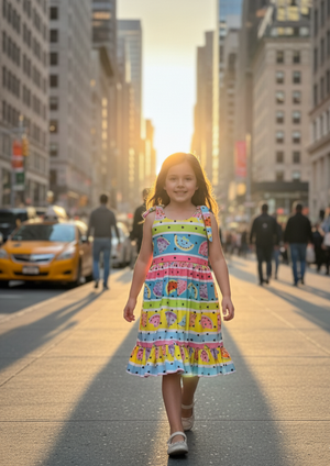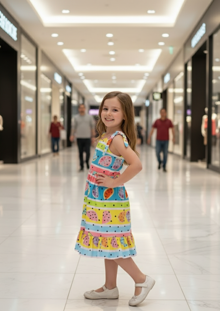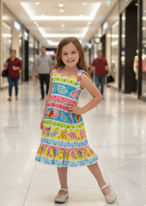 Este vestido é a cara do verão! Com uma estampa alegre e divertida de melancias e frutas, ele é ideal para passeios, festinhas temáticas (como "Magali" ou "Piquenique") e para o conforto do dia a dia.