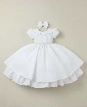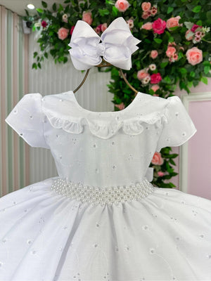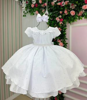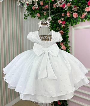 Confeccionado em tecido misto possui forro em poliéster e algodão para não incomodar a criança e proporcionando um caimento incrível e sofisticado, possui gola redonda, comprimento médio, mangas curtas, possui elástico nas costas para melhor ajuste, acabamento com lindo laço de pérolas para completar o look dos sonhos!