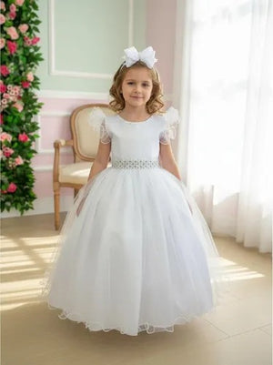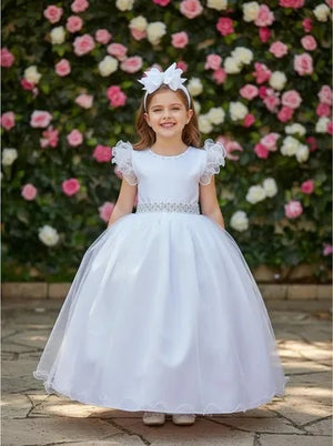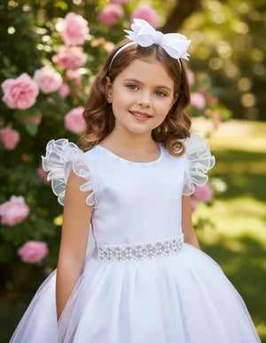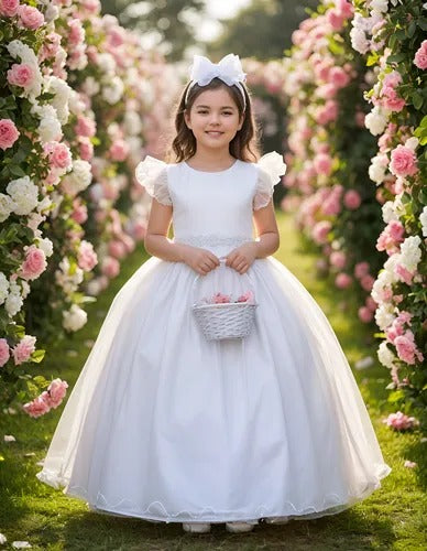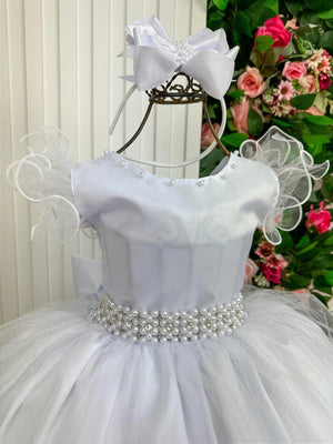 Confeccionado em tecido misto possui forro em poliéster e algodão para não incomodar a criança e proporcionando um caimento incrível e sofisticado, possui gola redonda,renda de flores e apliques de strass no peito, comprimento médio, mangas curtas, possui elástico nas costas para melhor ajuste, acabamento com lindo laço na parte posterior do vestido completa o look dos sonhos!