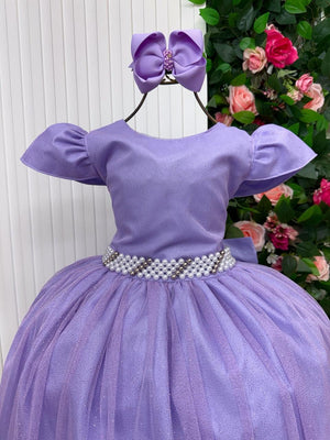 Confeccionado em tule com brilho suave, o modelo traz um caimento leve e elegante, com mangas e corpete estruturado que valoriza o visual clássico. O destaque vai para o cinto de pérolas entrelaçadas, que adiciona um toque de luxo e luminosidade à peça.
