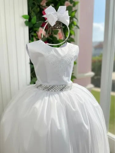 Confeccionado em tecido misto possui forro em poliéster e algodão para não incomodar a criança e proporcionando um caimento incrível e sofisticado, possui gola redonda,renda de flores e apliques de strass no peito, comprimento médio, mangas curtas, possui elástico nas costas para melhor ajuste, acabamento com lindo laço na parte posterior do vestido completa o look dos sonhos!